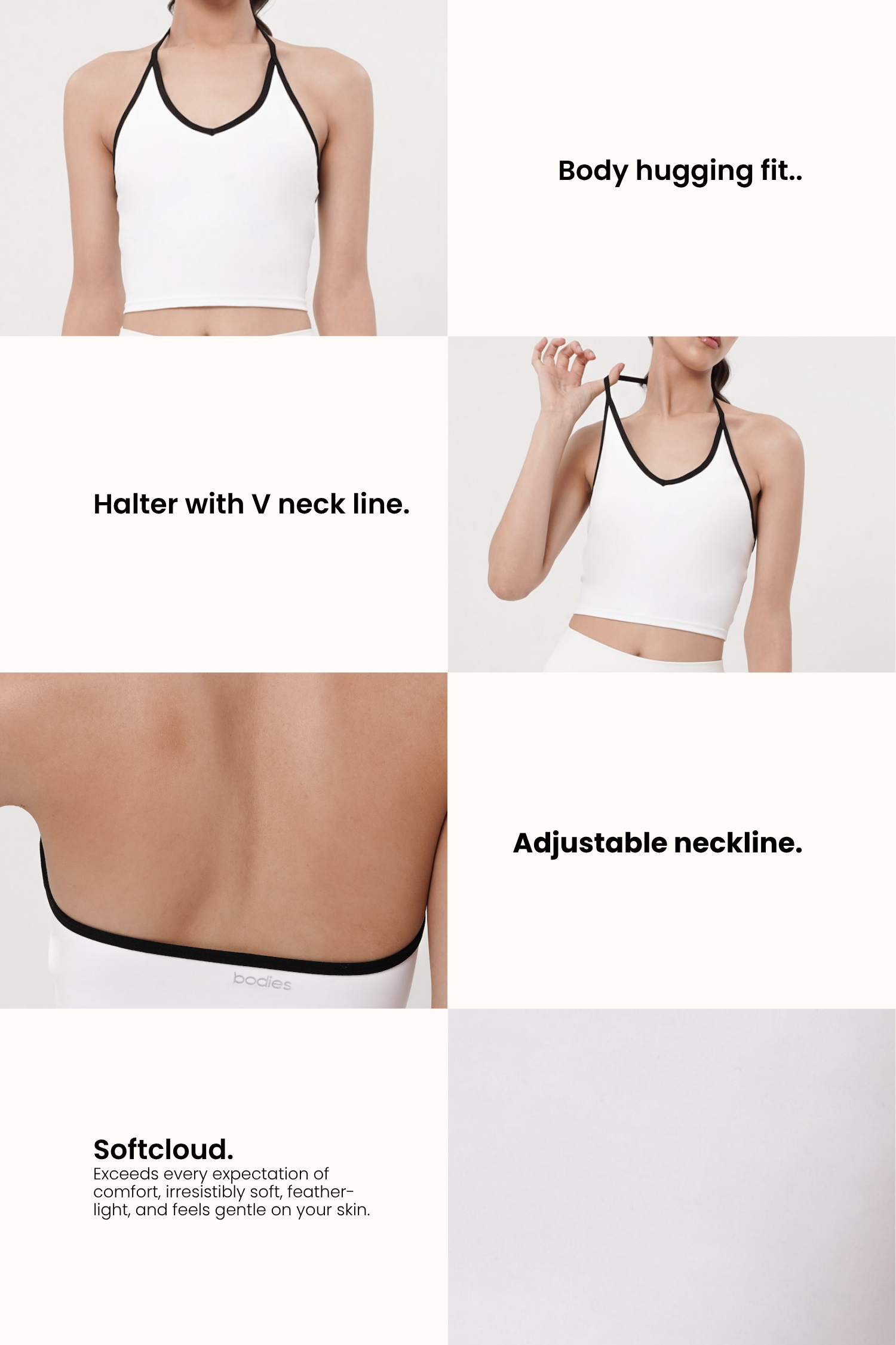 The Femme Bra Top is the perfect blend of elegance and performance. Designed with a flattering deep halter neckline and chic contrast trim, it brings a bold yet refined touch to your active wardrobe. With built-in bra pads for added shape and support, this top keeps you comfortable and confident through every stretch, swing, and movement. Ideal for pilates, yoga, tennis, golf, or padel — it’s your go-to piece for stylish, low- to medium-impact activity.