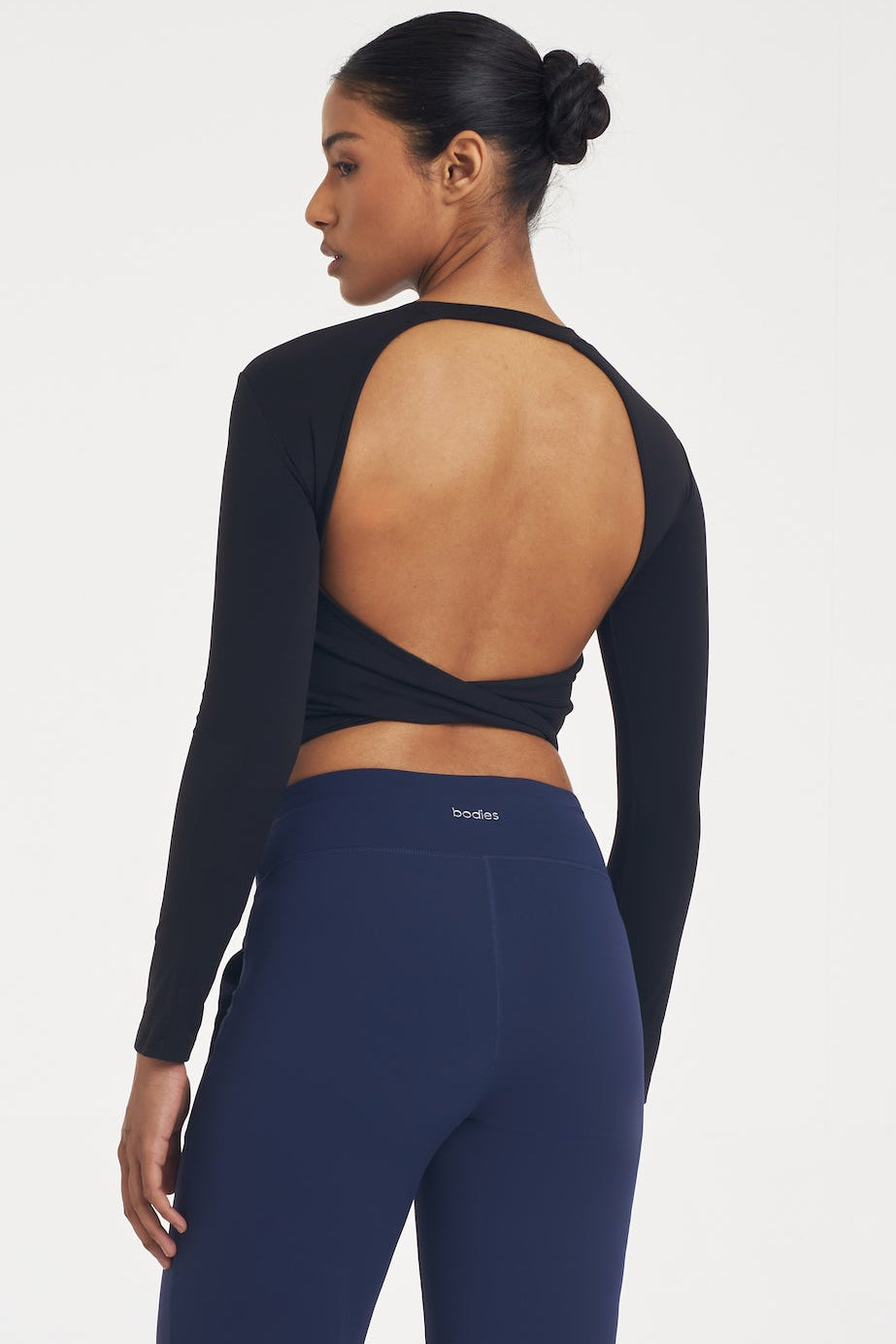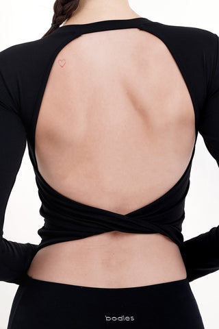 Elevate your activewear collection with the Twist-Back Long Sleeve Bra Top in Black, a chic and functional addition designed for your exercise routine. This versatile bra top is perfect for workouts, lounging, or a casual day out.