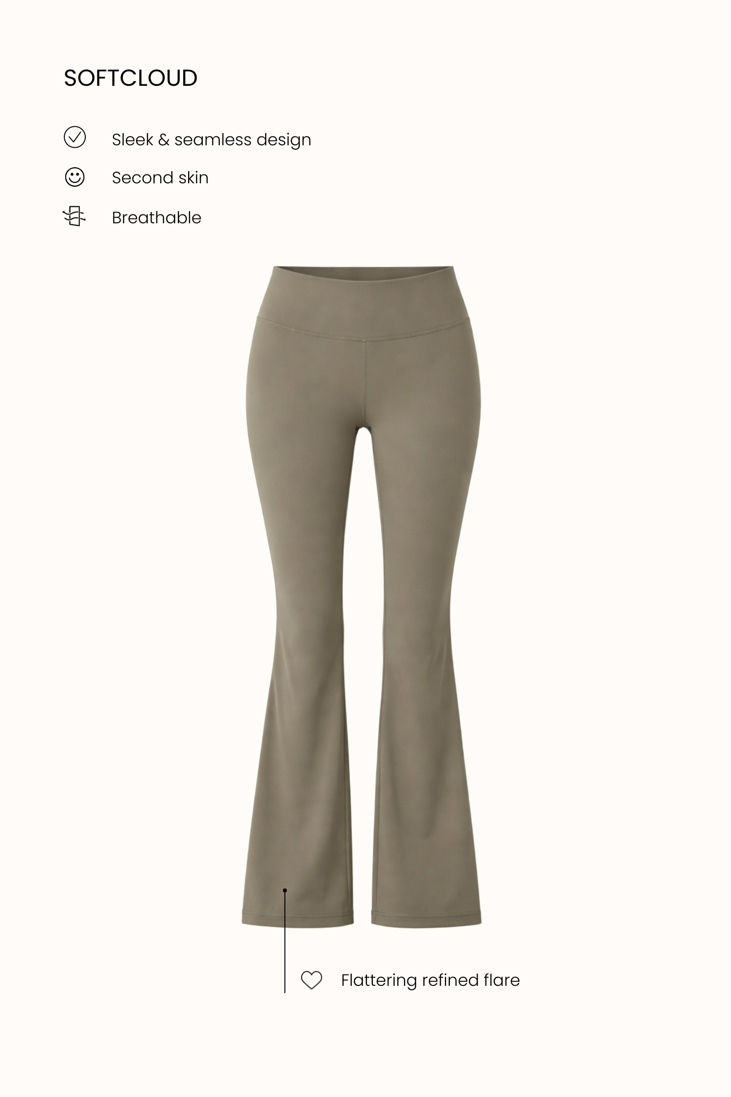 Designed to lengthen, smooth, and move with you. Ultrasoft Flare Pants bring a modern twist to a classic silhouette. The gentle flare at the hem creates a streamlined, leg-elongating look without feeling dramatic, while the soft stretch fabric hugs comfortably through the hips and thighs. With no pockets and no fuss, they deliver a clean, minimalist finish that works from studio sessions to everyday outfits with ease.
